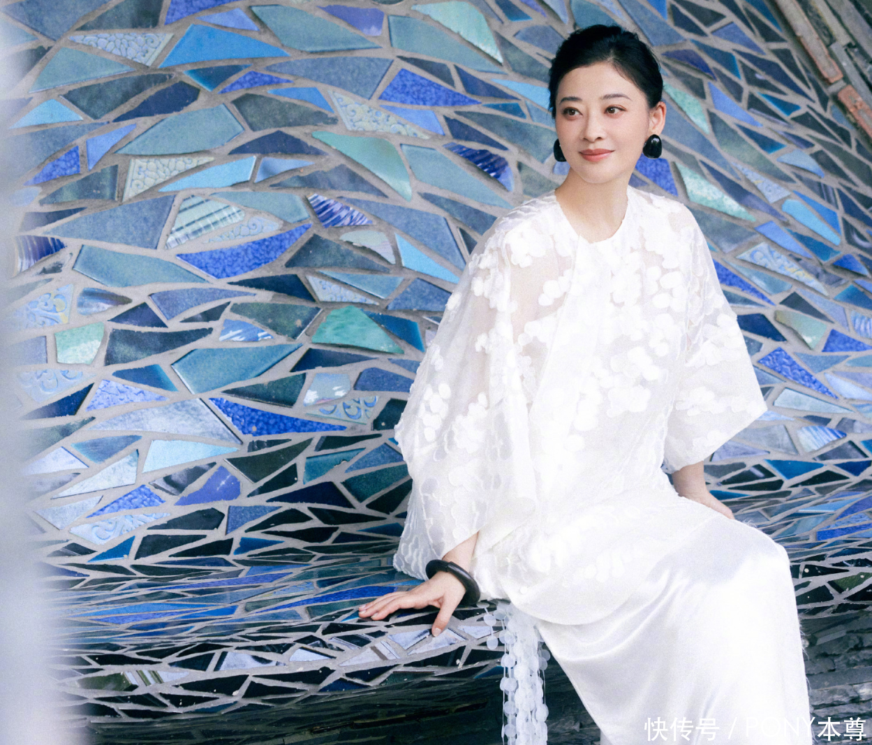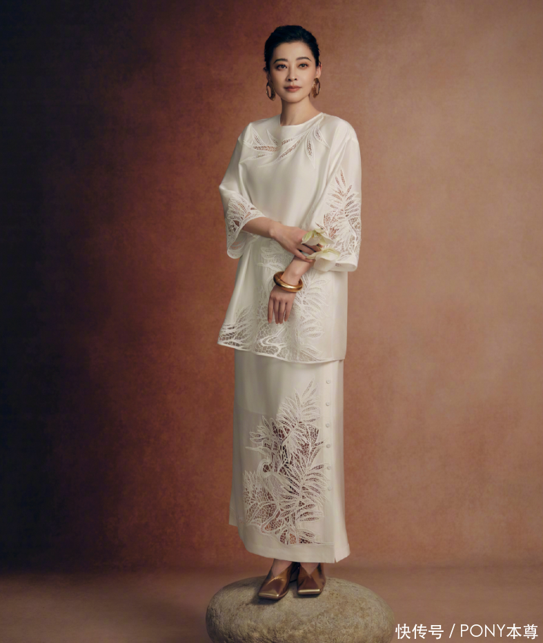 新中式穿搭最不容易出错的搭配思路就是上下同色!比如梅婷这一身白色新中式套装,上半身宽松的衣袖和圆领设计,让她看起来温婉有东方韵味!而搭配的白色缎面半身裙,既修饰了肤色,又让整体造型更显利落大气。